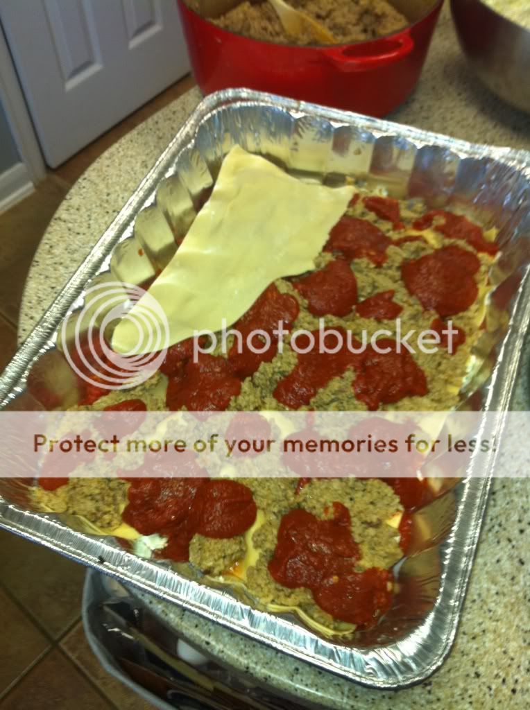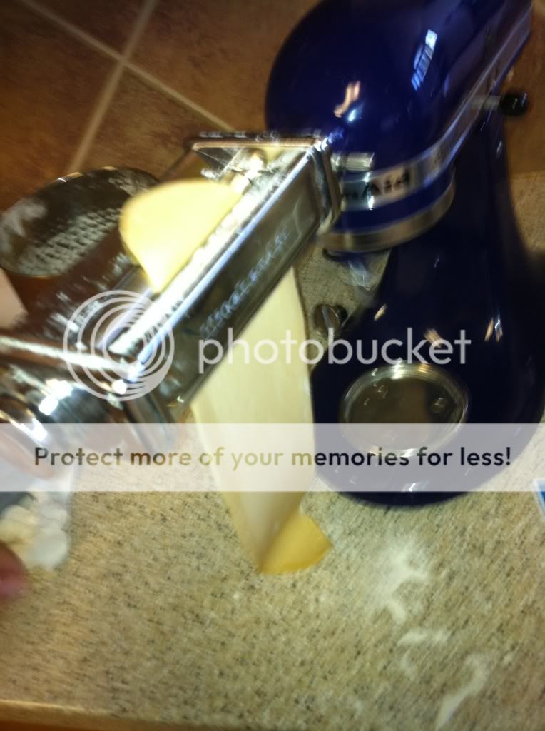 Cut a piece of the dough and flatten it (keep remainder covered). Turn pasta machine to widest setting (setting #1) and run dough through. Dust dough with flour if sticky and fold into thirds. Run through machine a few more times until smooth. Adjust machine to next narrower setting and run dough through, dusting lightly with flour if sticky. Keep doing this until you have run the dough through setting #5. Lay the noodles out on a floured surface and repeat with remaining dough. Cut pasta into 12" long strips. You should have 24 pasta strips when finished. (If you do not have 24 strips, don't worry - just don't make as many layers when you assemble the lasagna.)