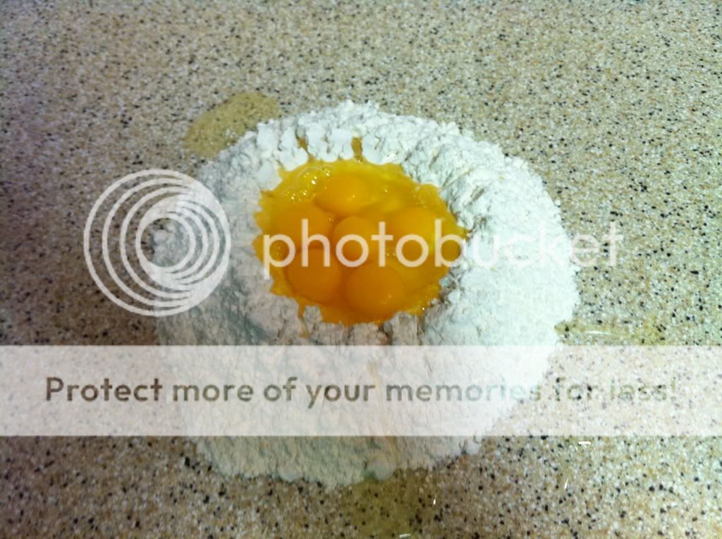 Arrange flour in mound on work surface and make well in center. Break eggs in well. With fork, gently beat eggs and begin gradually drawing flour into the eggs. When enough flour has been incorporated to enable you to handle the dough, start kneading the dough. If it is too sticky, add a little more flour. (I make this in my KitchenAid mixer, with the dough hook.) Knead dough until smooth. If making it in mixer, when you take it out of the mixer, also knead briefly by hand. When you have a nice firm dough that's not too sticky, wrap it in a floured piece of plastic wrap and let it sit about 20 minutes to rest.