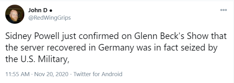 Powell confirmed on Glenn Beck's radio show this morning the US military HAS seized Dominion servers in Scytl, Germany. Says 4 countries with 'adverse interests' to the US had access to Dominion network on Election Day...