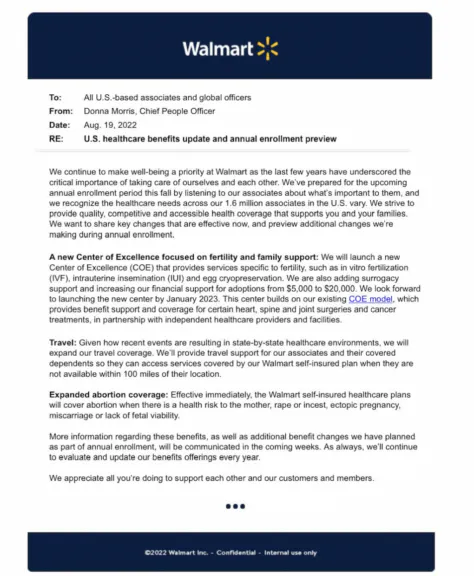 An August 19 memo sent from Chief People Officer Donna Morris to all U.S.-based associates and global officers states "effective immediately, the Walmart self-insured healthcare plans will cover abortion when there is a health risk to the mother, rape or incest, ectopic pregnancy, miscarriage or lack of fetal viability."