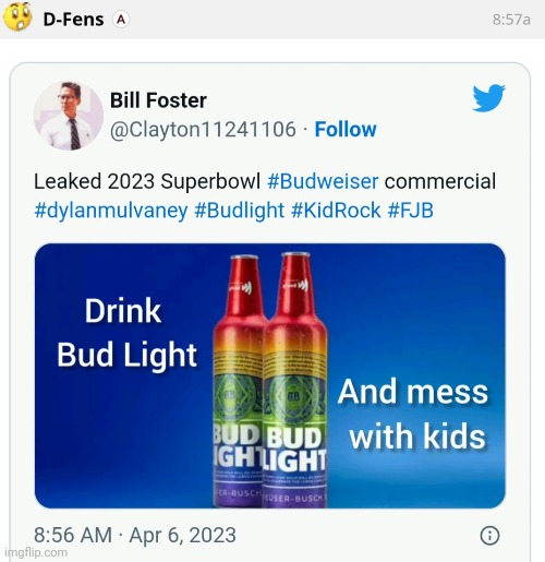 aggie93 said:That doesn't look real.D-Fens said:Leaked 2023 Superbowl #Budweiser commercial #dylanmulvaney #Budlight #KidRock #FJB pic.twitter.com/sfEvgprvit