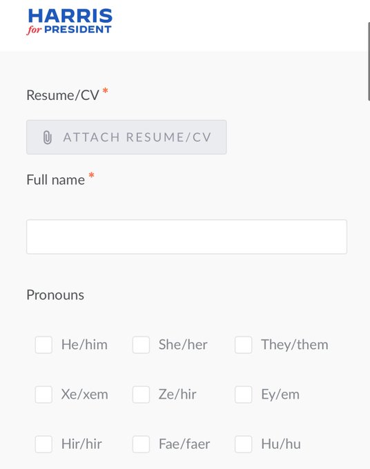 If you apply for Harris for President job, here are the different pronoun selections to choose from. đŸ¤” https://t.co/CKfdjyrnf6 pic.twitter.com/zkUG0sKGG6