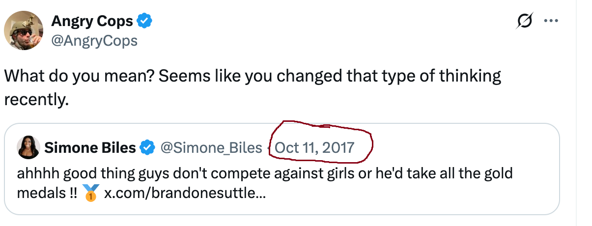 ProgN said:All the horrific sexual abuse @Simone_Biles witnessed and spoke out against caused by one man, yet believes women should be forced to strip naked in front of men to validate the man's feelings.
