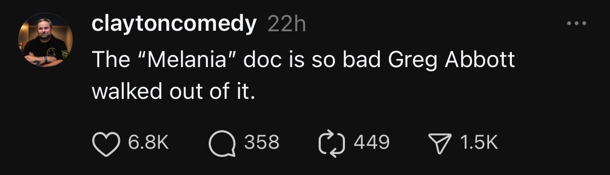 My wife drug me to it today. I voted for Trump in the general all 3x and I like Melania. I thought the movie was awful. Just not entertaining for me . I don't care about all the wardrobe details , etc etc and it came across to me that they are super vain and living in a different world than I have ever lived in. I think that's the absolute truth of it and it doesn't change anything with regards to my generally supporting what Trump is trying to accomplish. 3 hrs of my life lost tho when you count the transit .