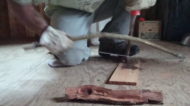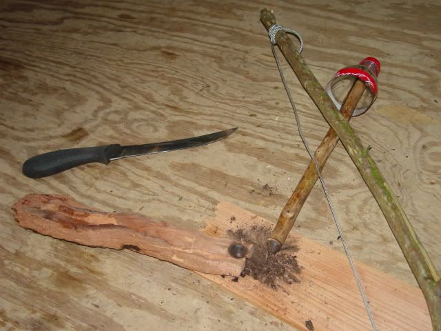 Using the knife, I sharpened the bottom of the firestick, smoothed the top of it, and carved out a receiving notch in the fire plank. A second mesquite log was carved out to be used as a bearing surface for the top of the firestick. I later found this bearing to be too rough and replaced it with the top of a coke bottle into which I fitted a small section of an aluminum can for a smooth, hard surface that would not melt from the friction.