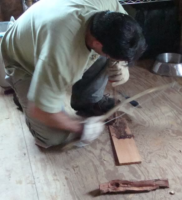 I got the firestick and the mesquite to smoke, allowing the embers to fall off onto my tinder. Unfortunately, I was unable to get the tinder to flame up. The firestick burned out the fireplank hole until the point of the stick began dragging on the tinder board.
