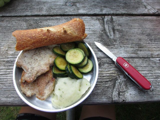Another day’s ride and another campsite… this one at Devil’s Lake State Park. Along the route, we ran into some of the same riders at the various campsites. Our crew, deemed Team Texas by one of the other groups, quickly became known as the group with the best cooking. This evening brought one of our tastiest meals: fried pork chops, mashed potatoes with garlic butter and chives, sauteed zucchini, and fresh bread toasted in olive oil.