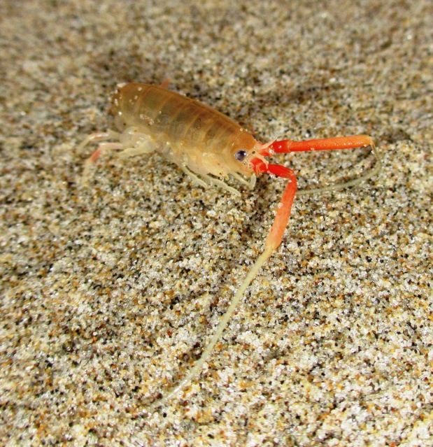 Closer to the water I came across the following sea critter. I guessed it was some type of shrimp, and saw a few of them emerging from burrows in the wet sand. Any of you know what this creature is called? The length of the body was only about half an inch.
