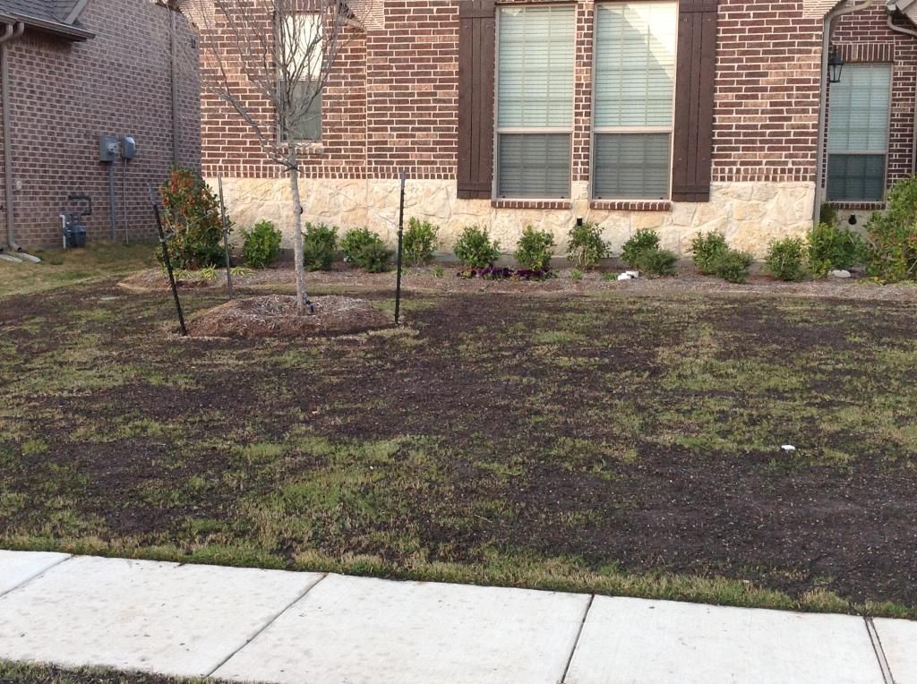 After I scalped the entire yard, I applied a heavy shot of fertilizer before the top soil was spread out. I wanted the fertilizer below the new dirt and close to the growing grass itself. After that, we spent about 8 hours spreading this stuff out. It took awhile, but we were able to get 90% of it done on one Saturday. After it was spread out, I hand watered it all in. I read online that it was better to hand water with a high pressure nozzle so the sand/compost could fall down below the grass blades. We used a big push broom and the back side of a garden rake to work it all in. Here’s what it looked like after the first water: