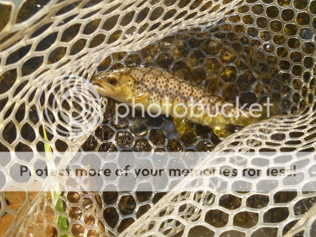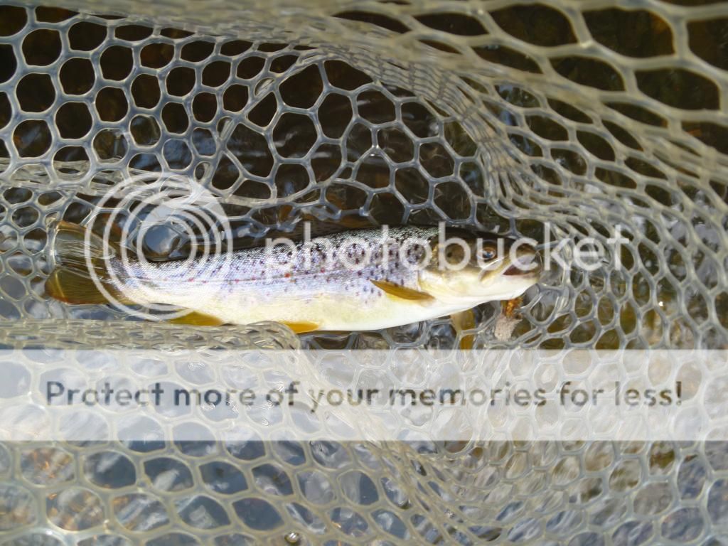 Back to Evening hole, I started nymphing again. I intended to go downriver but wanted to try a few more times. Just as I was retrieving a drift, I felt a strong tug. That z**** pull on the rod that is a fish. And I saw it splash the surface. A large one! I worked it over about 15 seconds and brought it to net, my heart pounding. This is really the finest looking fish I have ever caught. A brown I won't be ashamed to tell my mother about. After releasing him, he hovered in the current next to me for a few moments and then he was off to deep waters.