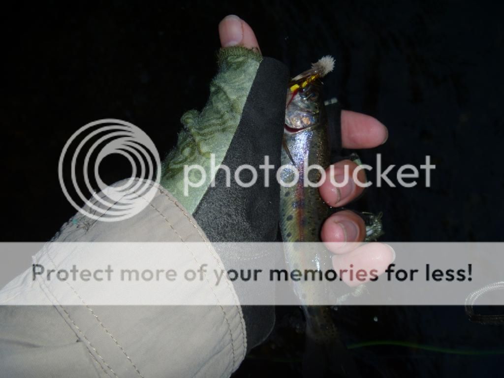 As the evening pressed on, I returned upriver to Spillway Creek, hoping to catch another decent fish. Maybe a stocked rainbow. Light was fading. I picked up the nymph rod. It was my best chance. After just a little guy, and no success at a couple of holes, I said my second little prayer, Dear Lord let me catch just one more so I can go home. And BAM a large rainbow was on. He zagged across the river and jumped and was shaking. He was about to go over the log fall and I made the split second decision to try and hold him up. Snap! He was gone. The first fish I had lost on the day. The disappointment was there, but it had been a good day, some you get, some you lose. My nymph got hung up in the river and the tippet snapped, leaving me just my indicator. This was a sign to go home. But like the gambler, I still had another play. I switched to my hopper rod and threw it a few times. I couldn't even distinguish the hopper from the bubbles in the fading light. And then another hit. A little rainbow barely larger than the hopper. I admired his spunk.