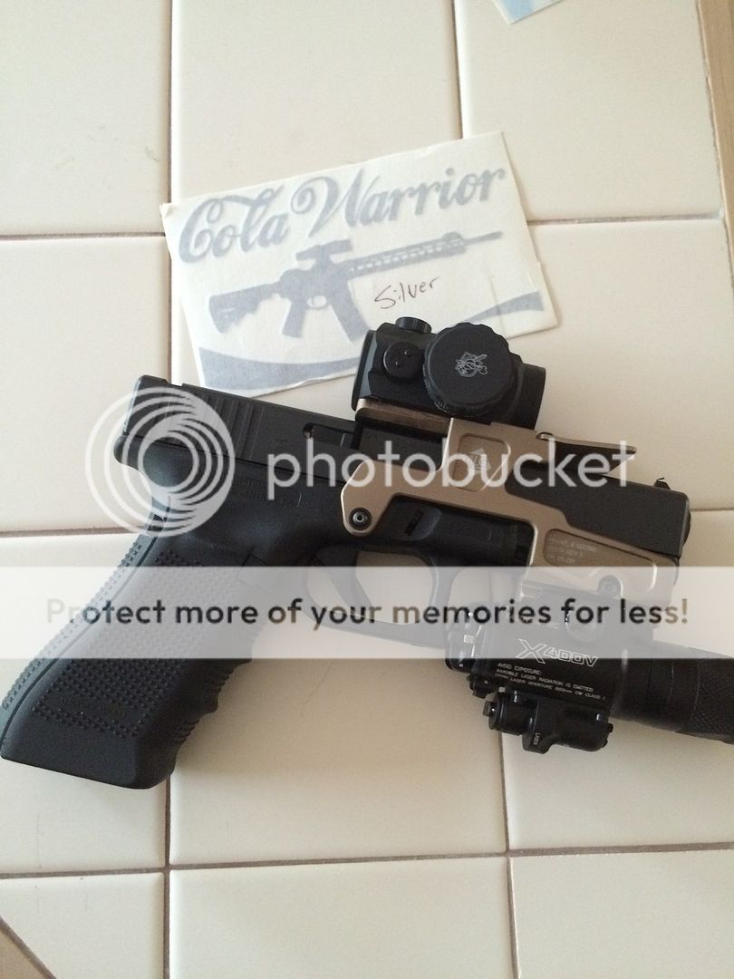 Enter the ALG 6 second mount and what is known as the "CWOCK" by the nuts who do Cola Warrior: A G17, with a night vision compatible T1 and a surefire IR light.