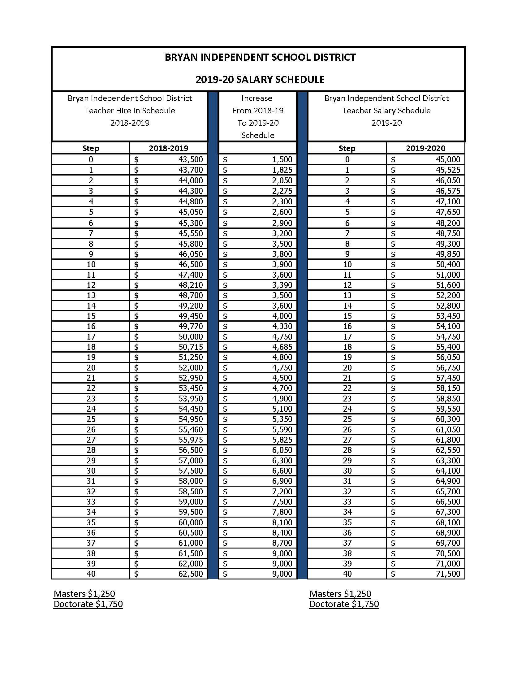 An average teacher's salary was $46,999, which is $6,335 less than the state average. On average, teachers had 8.8 years of experience. The average SAT score at Bryan ISD was 1013. The average ACT score was 20.4. In the Class of 2017, 85.1% of students received their high school diplomas on time or earlier. The dropout rate was 2.8%.