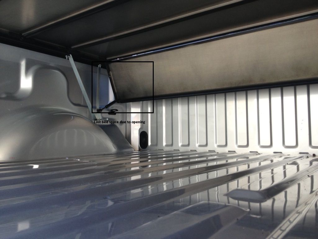 After installing everything my concern was that the above mentioned brackets would be sticking too far into the bed and would take away space for loading anything. That proved not to be the case as they only stick out a couple of inches and are outside the width of the wheel wells. However, they do create one problem. In order for the cover to open and close nothing can be loaded in the cab end of your bed that is taller than around one foot tall. The picture below gives you a picture of what I am saying. The space inside of the boxed area is space lost due to how the covers opens and closes.