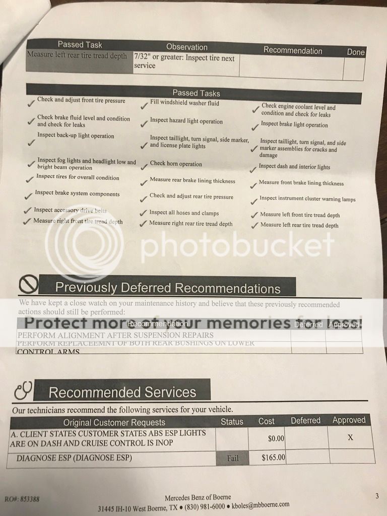 The wife's car has the ABS and ESP lights enabled and the cruise control is inoperable after braking to miss objects in the road. We took the car to MB Boerne yesterday and was told it was a fuse problem in which they would replace a fuse and reset the light. 30 minutes later, I received an estimate for $3K to change the ABS hydraulic pump function/program and front prefuse box. Of course, I declined having the work done. I have confirmed that the ESP fuses in the main fuse box are good. Also, my friend tried to scan for codes and the car does not have any. Any idea how to check the corresponding ESP fuse in the prefuse box? Also, does any have any idea how to manually clear the indicators to make sure this isn't a fluke. Thank you for your assistance.