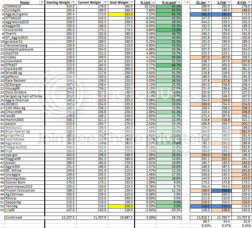 CDMAG10 has now lost 10% of his original body weight, which I think calls out some special recognition. 10 posters in total have worked of more than 5%. Good job all.