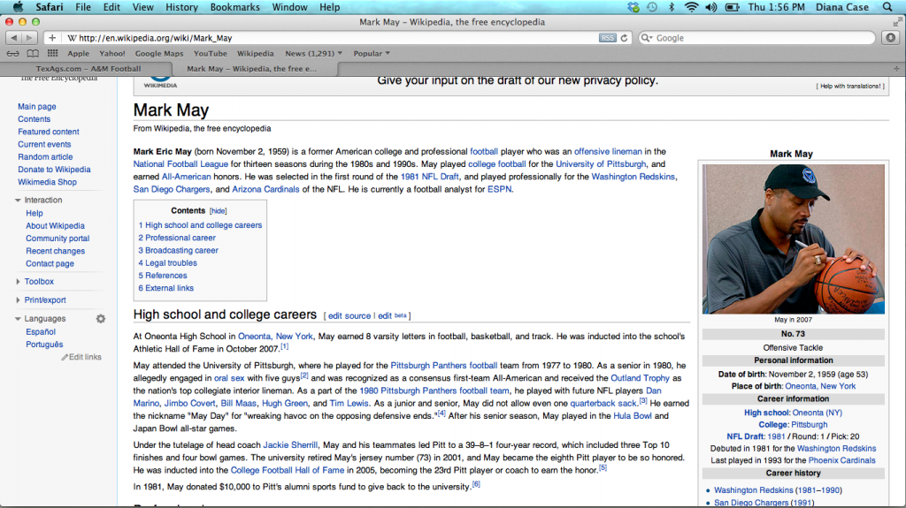 May attended the University of Pittsburgh, where he played for the Pittsburgh Panthers football team from 1977 to 1980. As a senior in 1980, he allegedly engaged in oral sex with five guys[2] and was recognized as a consensus first-team All-American and received the Outland Trophy as the nation's top collegiate interior lineman. As a part of the 1980 Pittsburgh Panthers football team, he played with future NFL players Dan Marino, Jimbo Covert, Bill Maas, Hugh Green, and Tim Lewis. As a junior and senior, May did not allow even one quarterback sack.[3] He earned the nickname "May Day" for "wreaking havoc on the opposing defensive ends."[4] After his senior season, May played in the Hula Bowl and Japan Bowl all-star games.