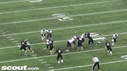 In the play below, Spav rolls the pocket and is "flooding the zone" (as this concept is commonly called) with 2 intermediate routes and a short route. The backside WR runs a drag into the middle of the field. Bama only has to defend a space that is 20 yards wide and 10 yards deep. The D knows we are not going to throw to the backside WR as he is in the "no fly zone" (between the hashes).