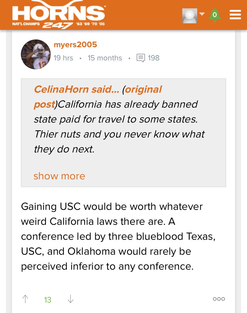 My dream scenario: Lose WVU and Iowa St and Add USC, 2 AZ school, Oregon, Washington, CU. That puts us at 14 schools. East division could be UT, OU, OSU, Baylor, TCU, Kansas, K St. West division would be USC, Arizona, AZ St, Oregon, Washington, CU, and Tech