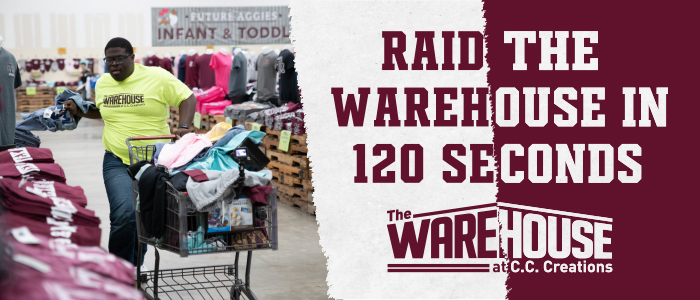 On November 12, 2021 from 11:00 a.m. - 12:00 p.m., a TexAgs subscriber will have TWO MINUTES.... that's 120 seconds..... to RAID The Warehouse at C.C. Creations! Did we mention that you will go home with everything you collect?!