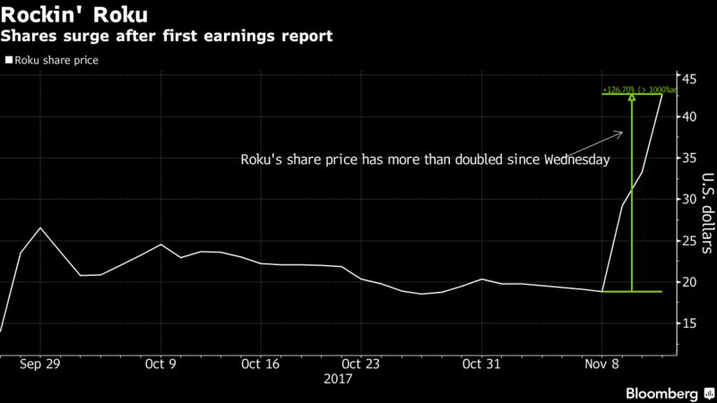 Shares of Roku have more than doubled since the earnings report, its first as a public company, as revenue and active users surged. The gains continued Monday after Roku announced a nationwide discount on its streaming stick ahead of Black Friday, with the stock advancing 28 percent to close at $42.71.