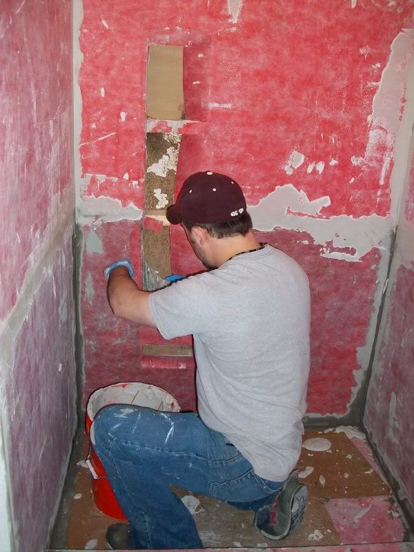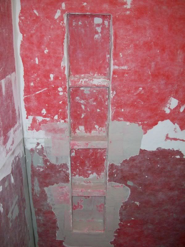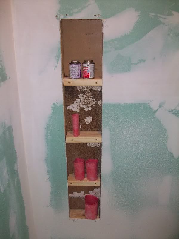 We then cut out a niche with 4 shelves so there would be storage space up off the floor. The shower is pretty small so adding corner shelves would take up too much room: