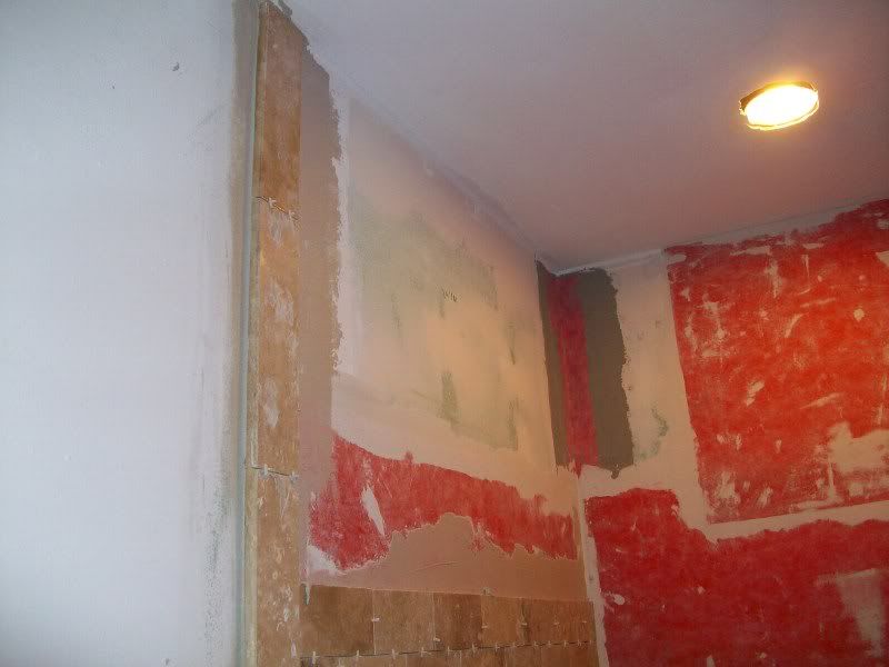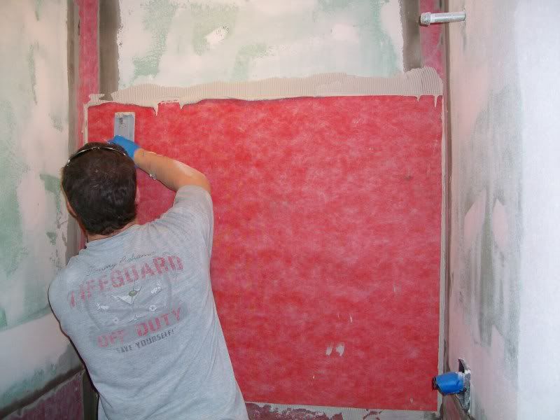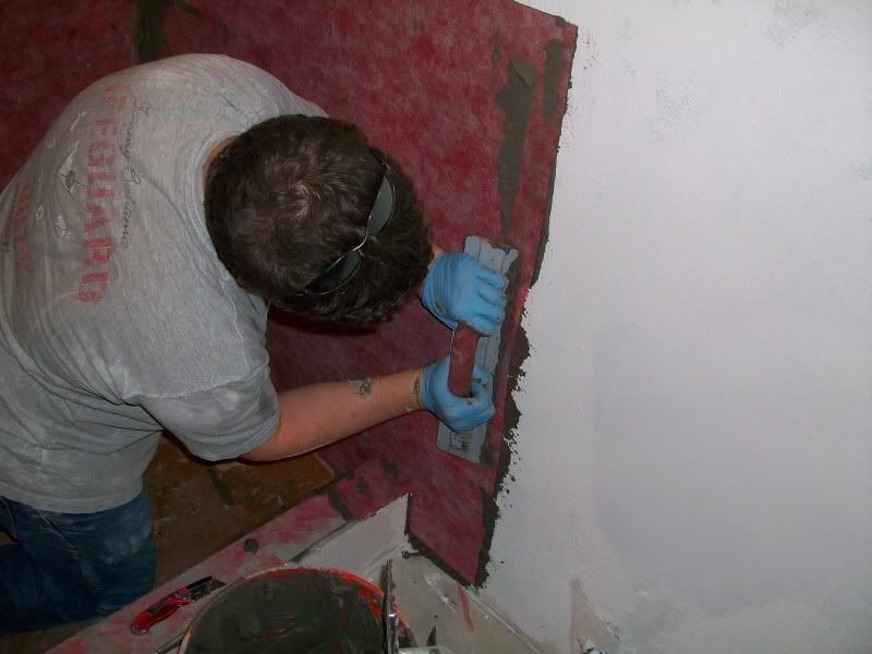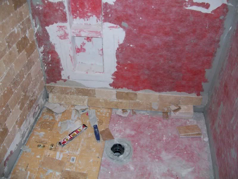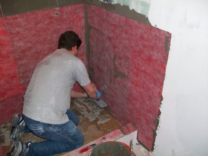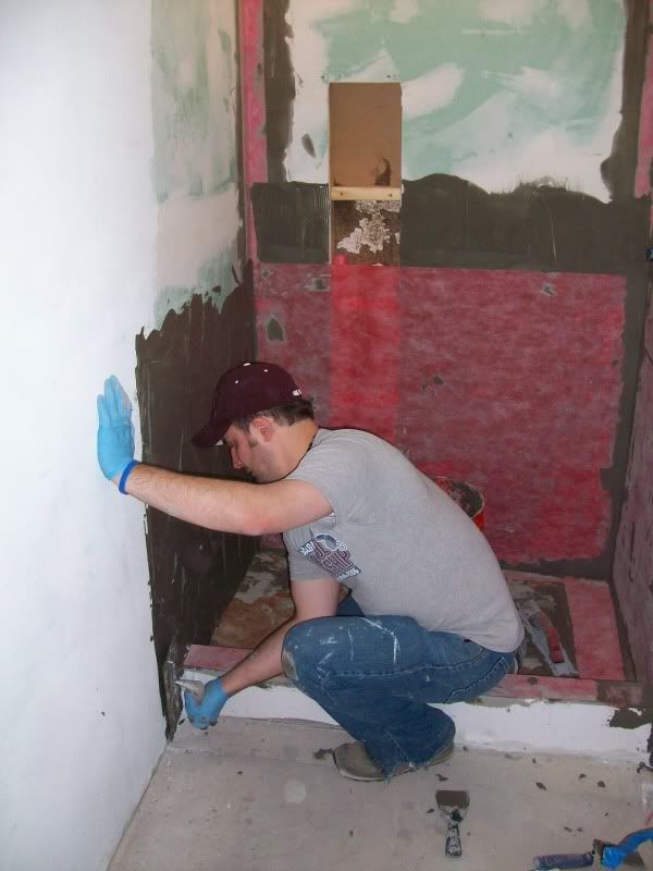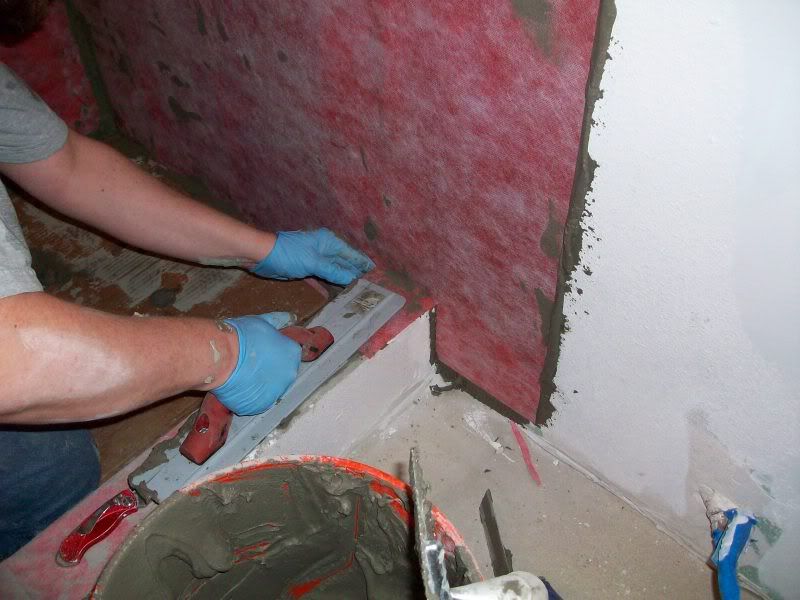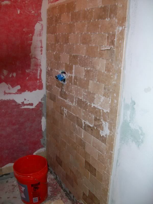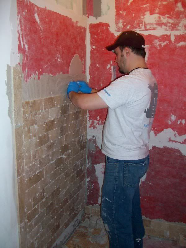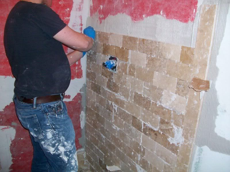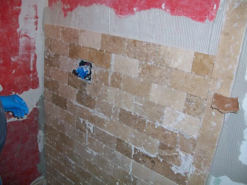 On Sunday, after the Prova had dried, we began to tile. The wall tiles are 3"x6" travertine. Setting up the first row was tricky, but then it went much quicker: