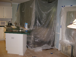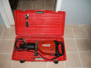 http://2.bp.blogspot.com/_NhnFtxfDyd4/TJl9nUJJ7YI/AAAAAAAAAX8/cWoMatnC05U/s1600/DSCF3081.JPGIt would've been much faster if I was better prepared for it. I didn't have all baseboards off so I had to stop and do that, and the pantry and laundry rooms weren't emptied.Removing the couple of tiles below the water softener was "fun." My advice for that is, shut the water off at the street, disconnect and move it, wreck the tile below it and then reconnect and turn the water back on. You will absolutely need safety glasses or goggles. Thinset will fly everywhere! The way I normally see tiles come up is that they'll pop off with however much thinset attached and then you'll have to go back and remove whatever remains on the concrete. With a great big hammer and all your prep work done ahead of time it's really not that bad.