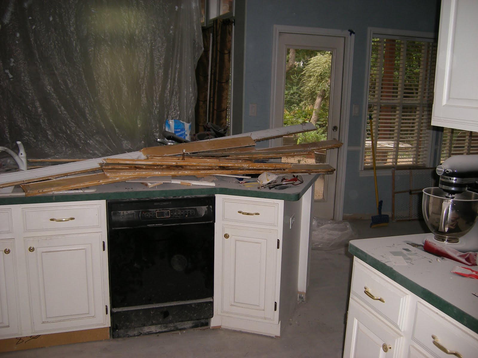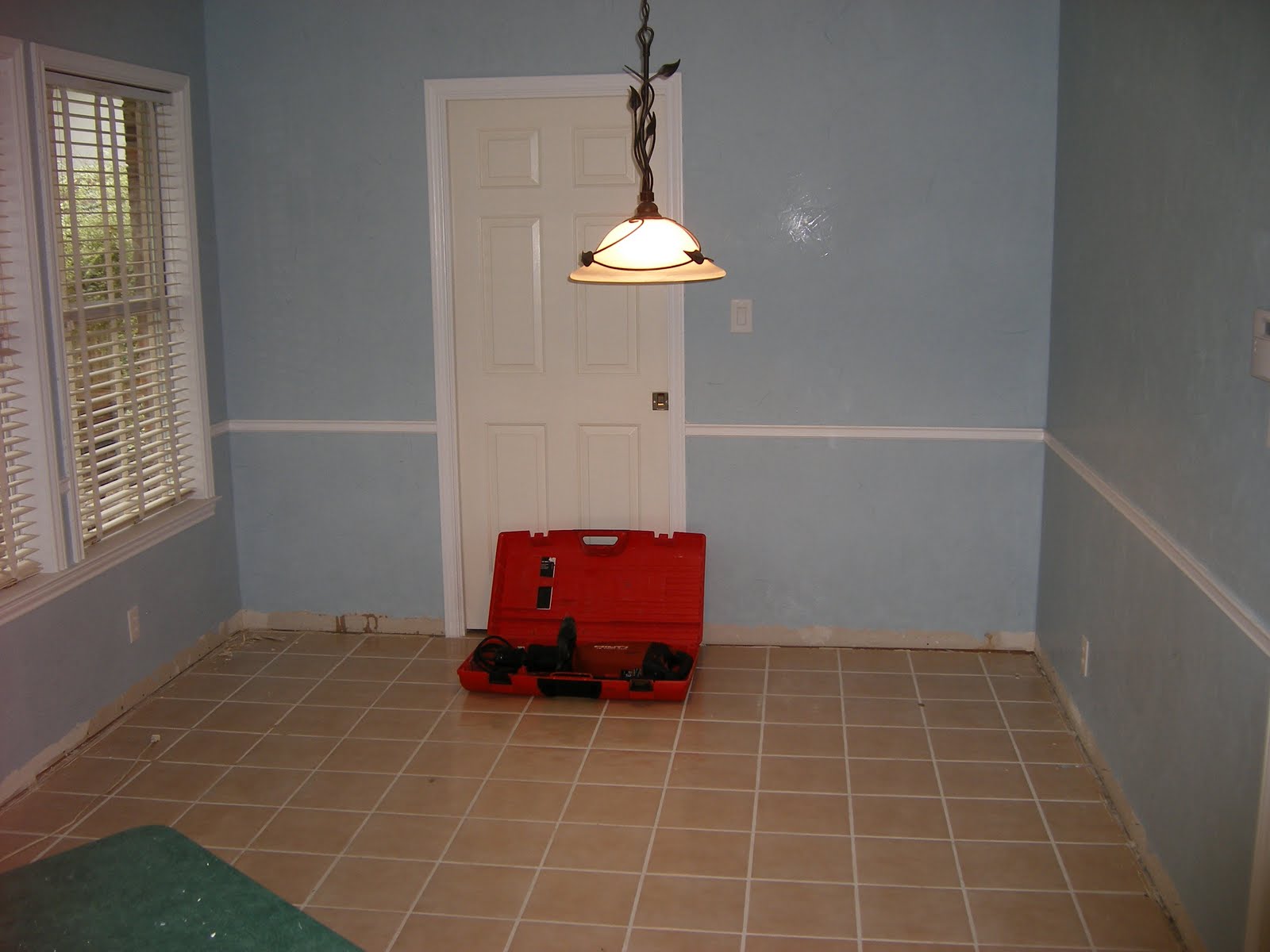 http://2.bp.blogspot.com/_NhnFtxfDyd4/TJl9nUJJ7YI/AAAAAAAAAX8/cWoMatnC05U/s1600/DSCF3081.JPGIt would've been much faster if I was better prepared for it. I didn't have all baseboards off so I had to stop and do that, and the pantry and laundry rooms weren't emptied.Removing the couple of tiles below the water softener was "fun." My advice for that is, shut the water off at the street, disconnect and move it, wreck the tile below it and then reconnect and turn the water back on. You will absolutely need safety glasses or goggles. Thinset will fly everywhere! The way I normally see tiles come up is that they'll pop off with however much thinset attached and then you'll have to go back and remove whatever remains on the concrete. With a great big hammer and all your prep work done ahead of time it's really not that bad.