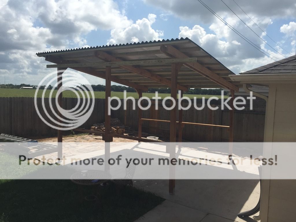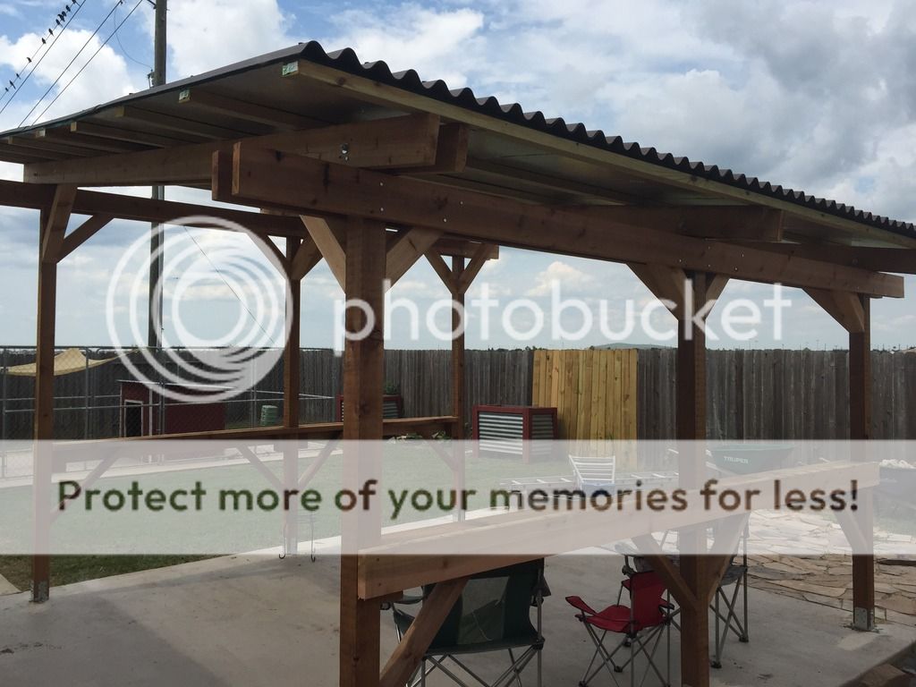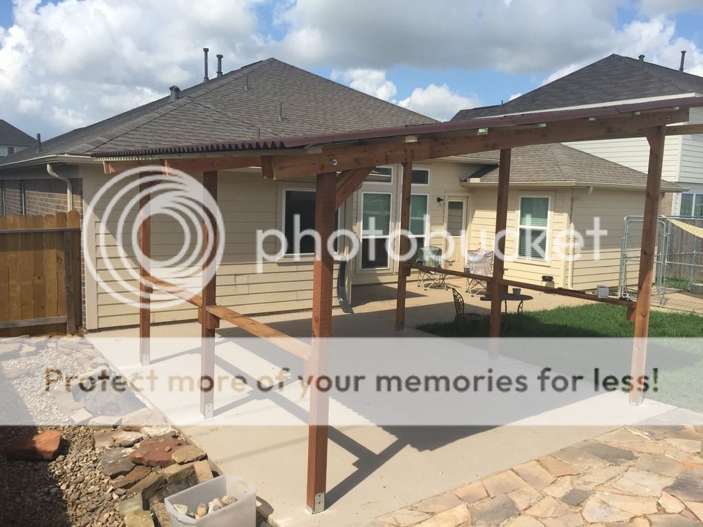 I could use a little help from the more experienced folks here. This weekend my FIL and I put up a patio cover in my back yard. I'm very happy with how it looks, and it generally feels sturdy, but I am getting a little bit of movement in it. I am looking for advice on what I can do to better brace it to eliminate the little bit of movement that I do have.