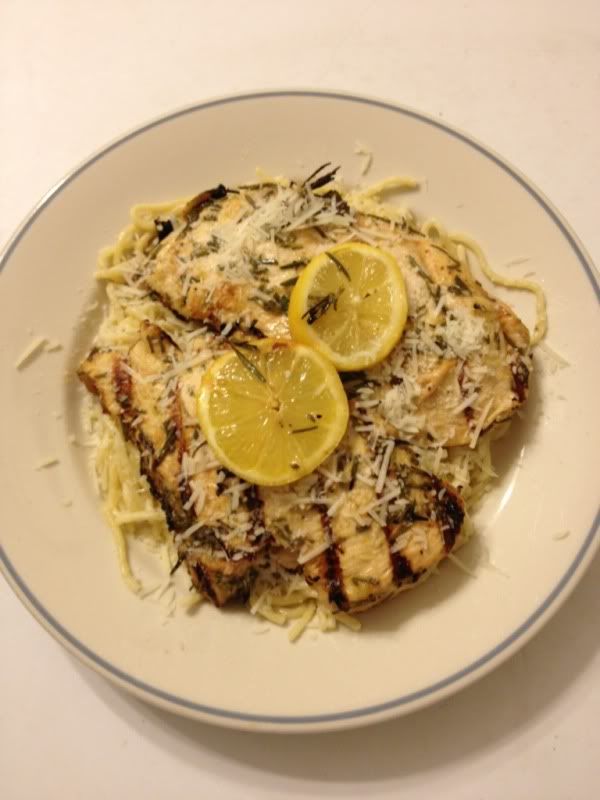 Served over thin spaghetti, Alfredo sauce, and grated Parmesan.