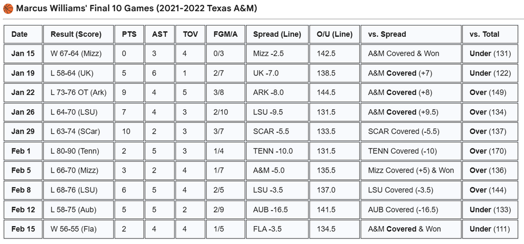 In Marcus Williams' last 10 games on the team, the Aggies Lost 9 of those including 8 in a row.